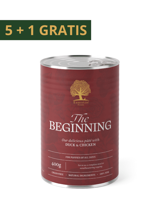 Essential The Beginning Can is een heerlijke paté met stukjes eend en kip. Een complete maaltijd of overheerlijke topping voor puppy's van alle rassen en maten.