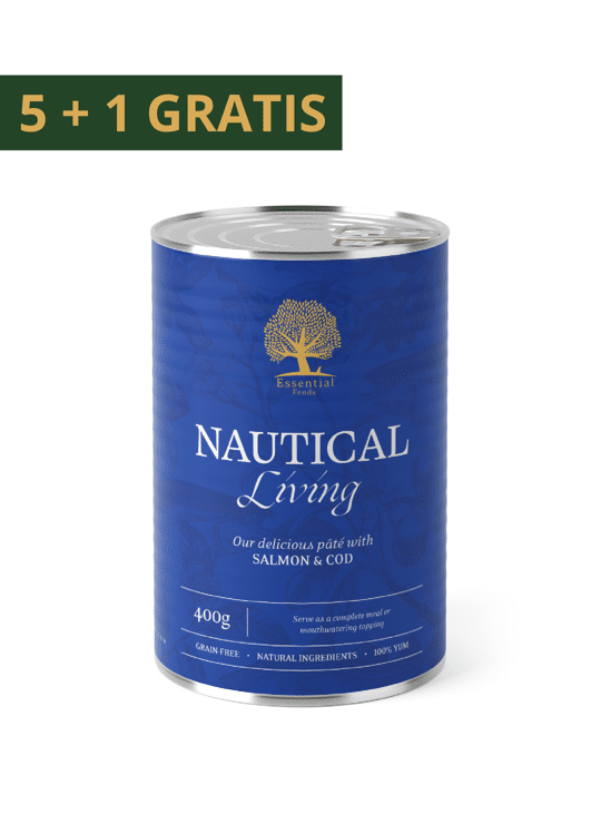 Essential Nautical Living Can is een heerlijke paté met zalm en kabeljauw voor volwassen honden. Het kan worden geserveerd als een complete maaltijd, maar gaat net zo goed als een overheerlijke topping. Het is graanvrij, uitsluitend op basis van vis en met alleen natuurlijke ingrediënten. Het is een hit bij visliefhebbers!