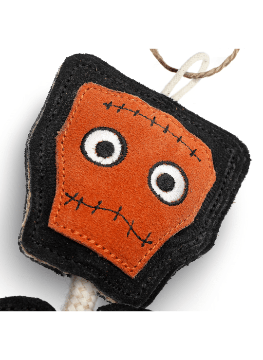 Griezelig en duurzaam speelplezier voor honden van alle leeftijden! Frankie is gemaakt van suède met een natuurlijke vulling en armen en benen van jutetouw.