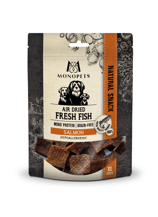 Monopets air dried snacks Fresh Fish Salmon Cubes XL is een smaakvolle snack op basis van één dierlijke eiwitbron. Deze graanvrije en hypoallergene snack van zalm is een natuurlijke traktatie en bevat zorgvuldig geselecteerde ingrediënten. Het product is geschikt voor alle levensfasen.