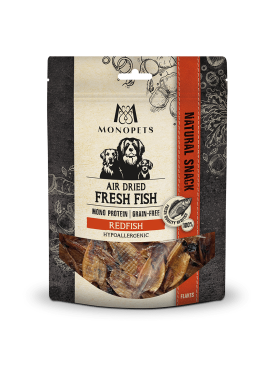 Monopets air dried snacks Fresh Fish Redfish flakes is een smaakvolle snack op basis van één dierlijke eiwitbron. Deze graanvrije en hypoallergene snack van roodbaars is een natuurlijke traktatie en bevat zorgvuldig geselecteerde ingrediënten. Het product is geschikt voor alle levensfasen.