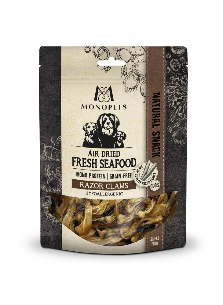Monopets air dried snacks Fresh Fish Sea Food Razor clams is een smaakvolle snack op basis van één dierlijke eiwitbron. Deze graanvrije en hypoallergene snack van scheermes is een natuurlijke traktatie en bevat zorgvuldig geselecteerde ingrediënten. Het product is geschikt voor alle levensfasen.