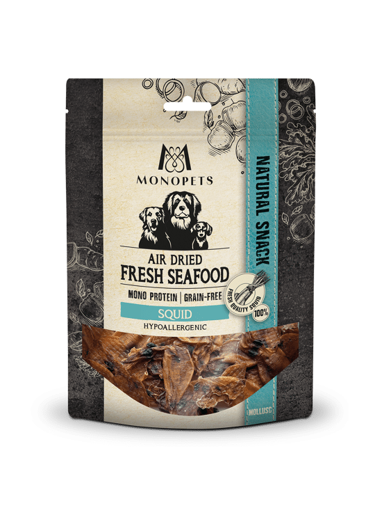 Monopets air dried snacks Fresh Fish Sea Food Squid is een smaakvolle snack op basis van één dierlijke eiwitbron. Deze graanvrije en hypoallergene snack van inktvis is een natuurlijke traktatie en bevat zorgvuldig geselecteerde ingrediënten. Het product is geschikt voor alle levensfasen.
