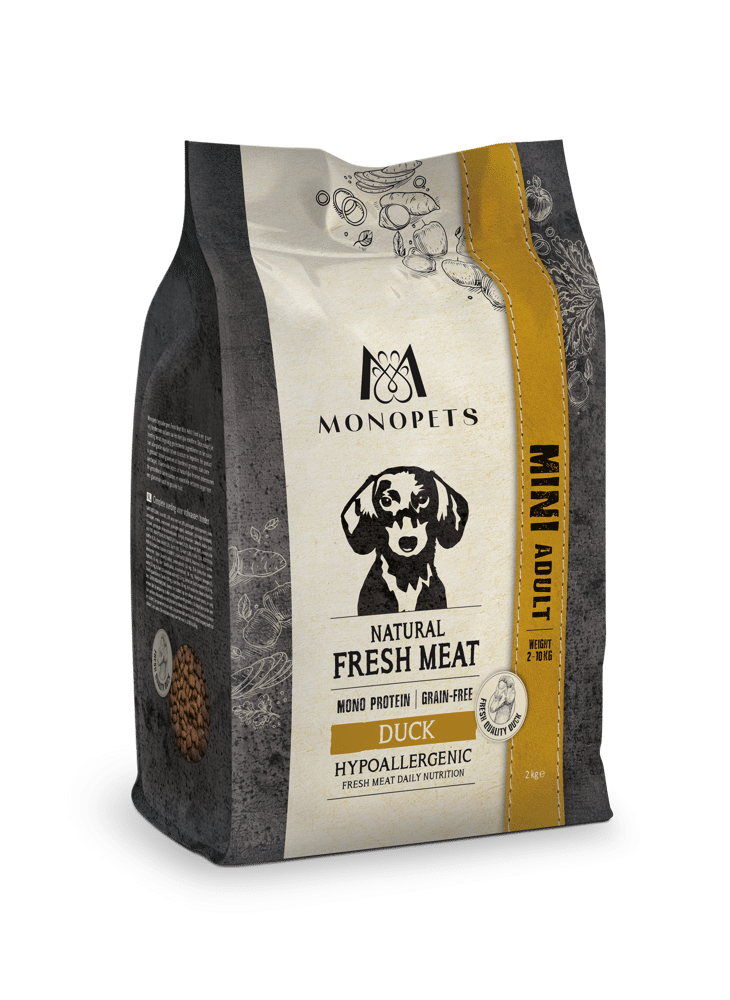 Monopets Fresh Meat Mini Adult Eend is een smaakvol graanvrij hondenvoer op basis van één dierlijke eiwitbron. Het product is gemaakt zonder granen en zit boordevol groenten en fruit, zoals zoete aardappel en appel. Waardevolle vezels uit prebiotica en natuurlijke bronnen ondersteunen de gezondheid van de darmen, en essentiële vetzuren zorgen voor een glanzende vacht en gezonde huid.