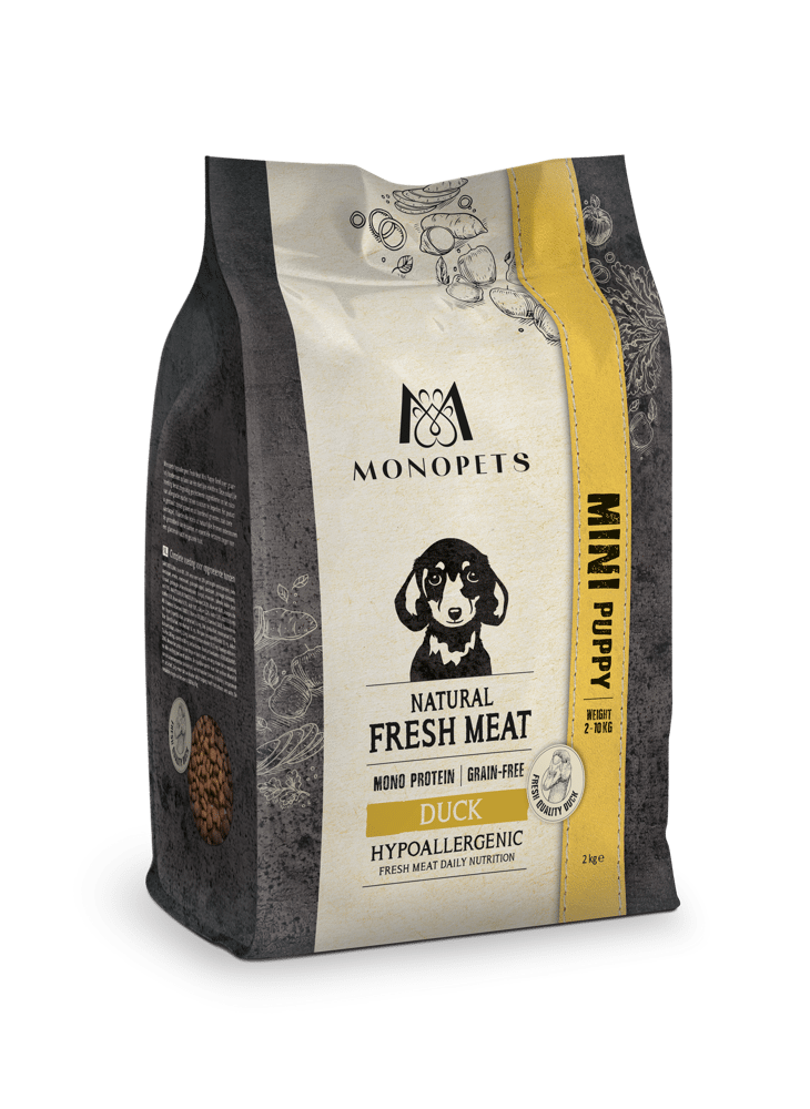 Monopets Fresh Meat Mini Puppy Eend is een smaakvol graanvrij hondenvoer op basis van één dierlijke eiwitbron. Het product is gemaakt zonder granen en zit boordevol groenten en fruit, zoals zoete aardappel en appel. Waardevolle vezels uit prebiotica en natuurlijke bronnen ondersteunen de gezondheid van de darmen, en essentiële vetzuren zorgen voor een glanzende vacht en gezonde huid.