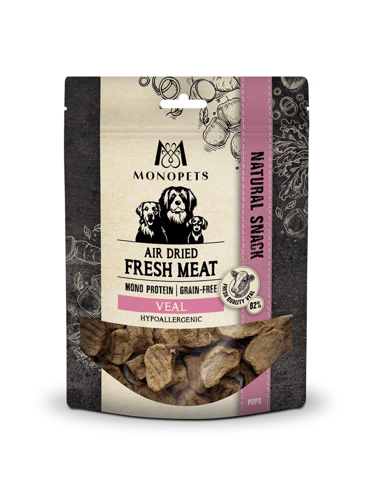 Monopets air dried snacks Veal Pops is een smaakvolle snack op basis van één dierlijke eiwitbron. Deze graanvrije en hypoallergene snack van kalfsvlees is een natuurlijke traktatie en bevat zorgvuldig geselecteerde ingrediënten. Het product is geschikt voor alle levensfasen.