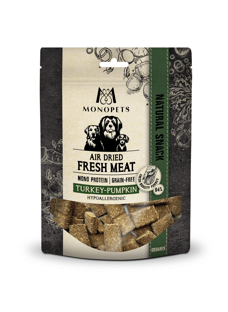 Monopets air dried snacks Turkey Squares with Pumpkin is een smaakvolle snack op basis van één dierlijke eiwitbron. Deze graanvrije snack van kalkoen is een natuurlijke traktatie en bevat zorgvuldig geselecteerde ingrediënten. Het product is rijk aan vezels ter ondersteuning van de spijsvertering.