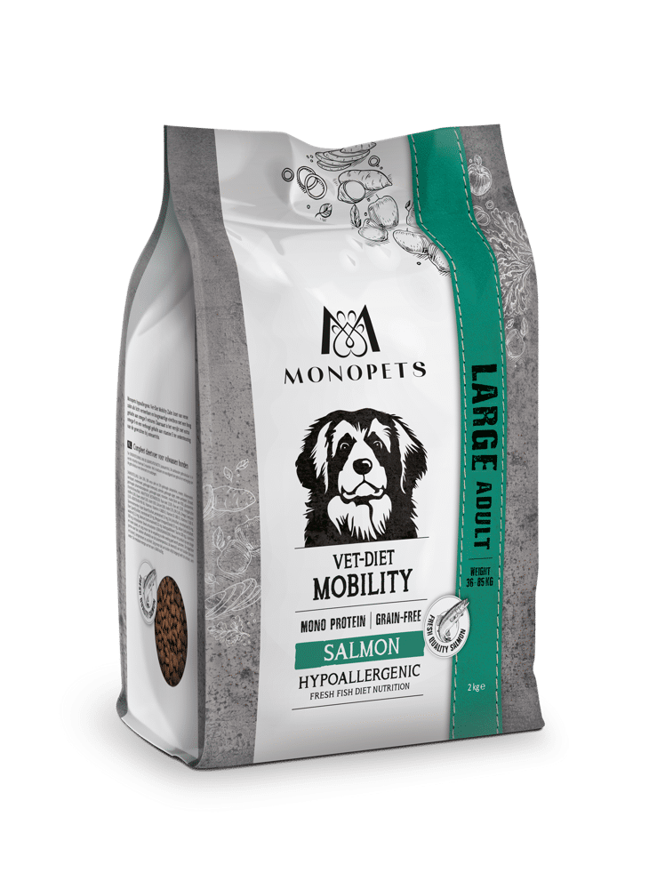 Monopets Large Vet-Diet Mobility Zalm: Inzet van verse zalm als licht verteerbare en hoogwaardige eiwitbron met een hoog gehalte aan omega-3 vetzuren. Daarnaast is het verrijkt met extra omega-3 en een verhoogd gehalte aan vitamine E ter ondersteuning van de gewrichten bij osteoartritis.