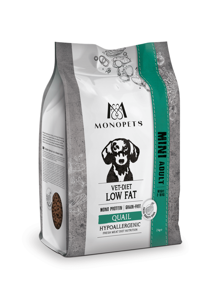 Monopets Mini Vet-Diet Low Fat Kwartel: Dieetvoeder ter vermindering van overgewicht. Dankzij een combinatie van een laag vetgehalte, verhoogd gehalte aan vezels en inzet van L-carnitine wordt het nastreven van een optimaal lichaamsgewicht ondersteunt. Graanvrij recept op basis van verse kwartel als dierlijke eiwitbron.